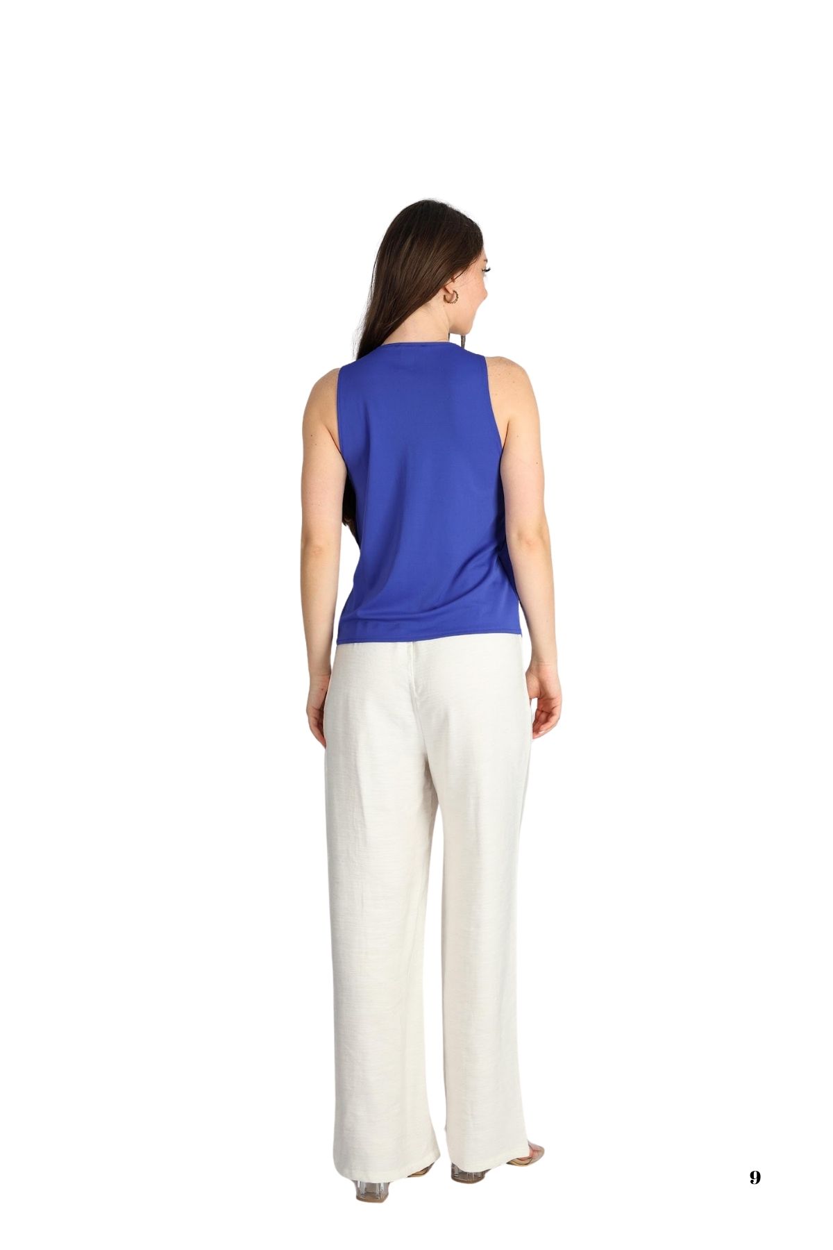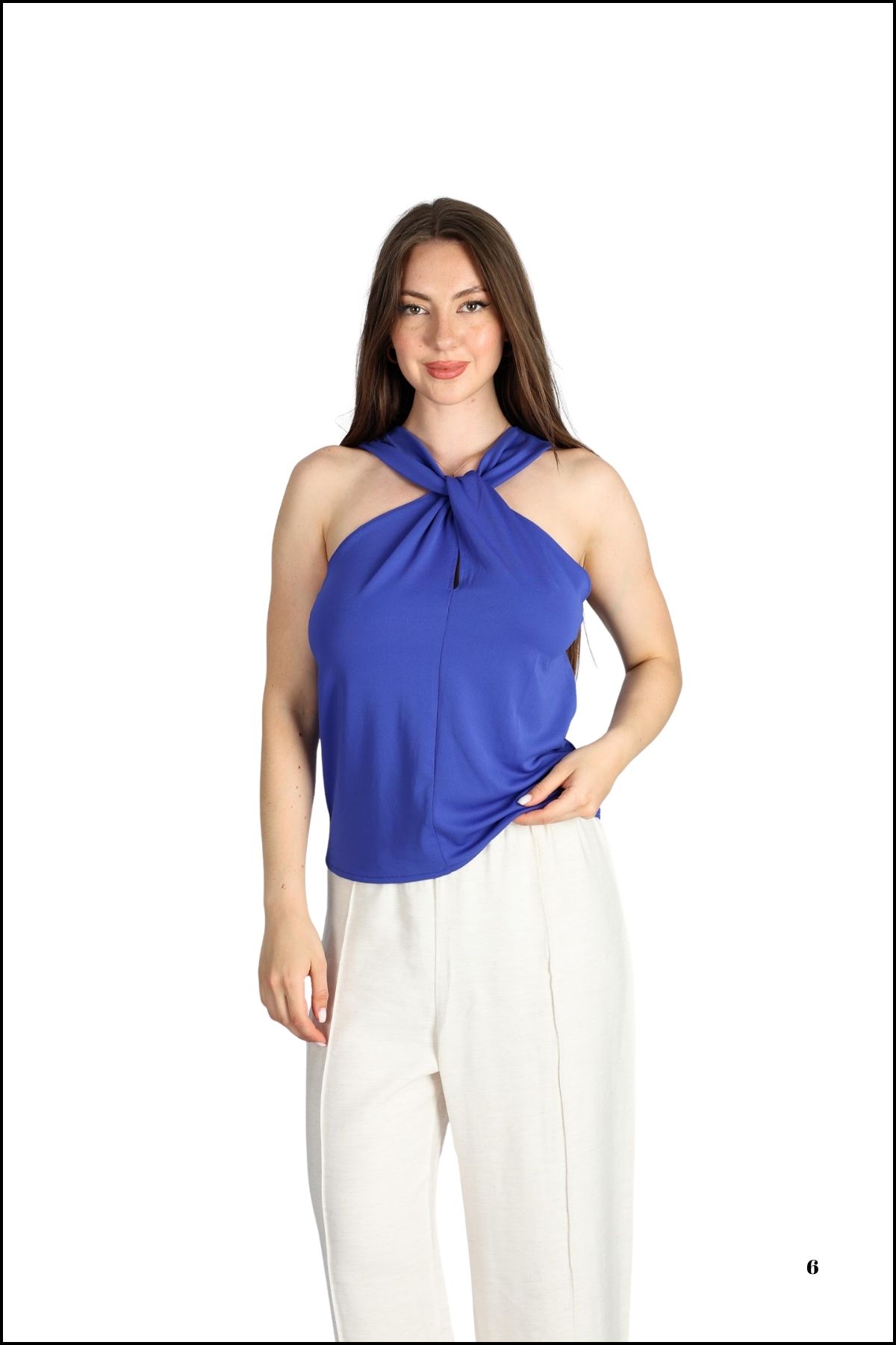 HALTER YAKA DÖKÜMLÜ SAKS MAVİSİ KREP BLUZ